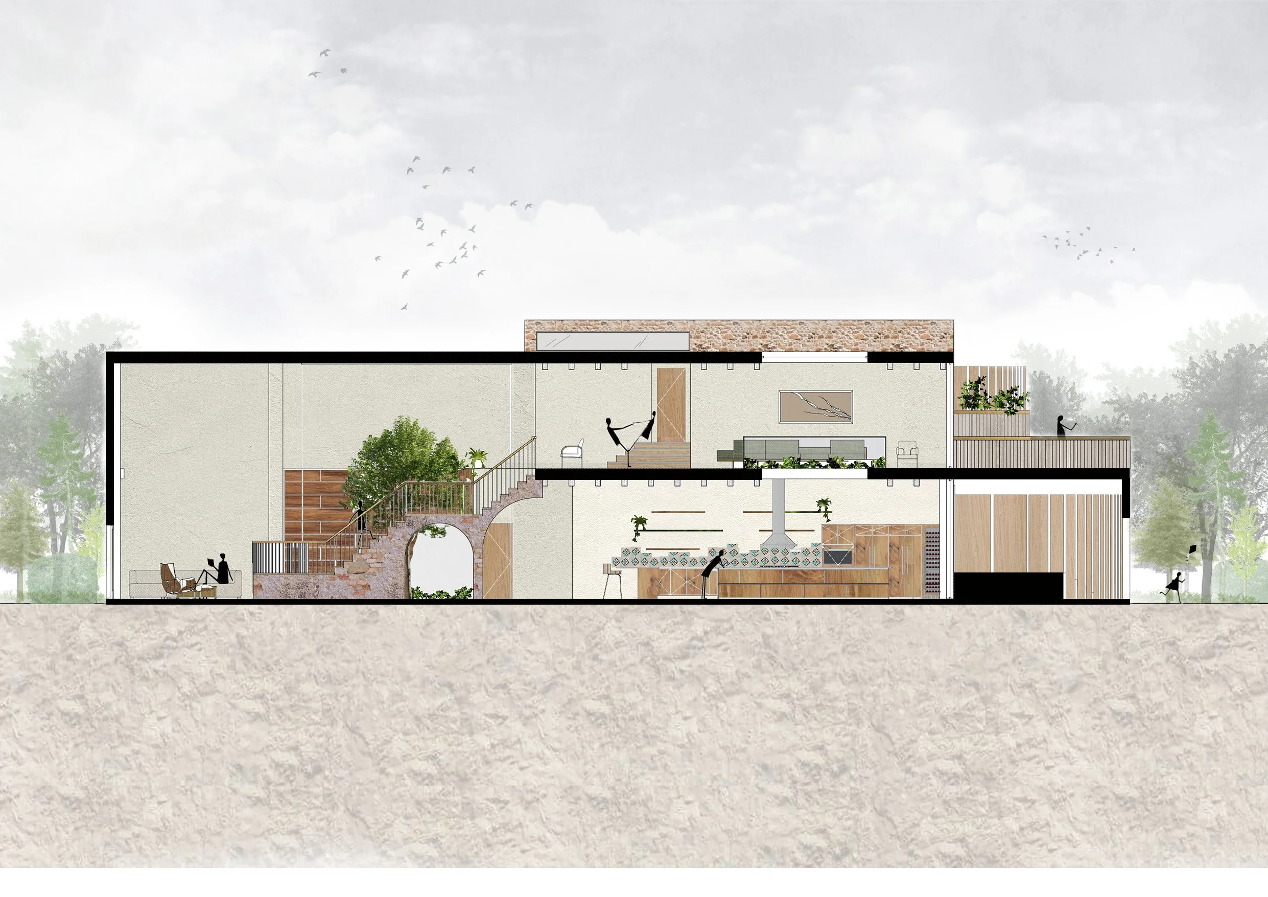 Designed for a French chef and their family, this captivating residence boasts a spacious kitchen as its centerpiece, meticulously crafted to inspire culinary creativity. An inner courtyard adds a touch of tranquility, providing a verdant sanctuary for growing herbs and infusing the home with natural light. Above the dining table, a void in the ceiling allows lush greenery to cascade down from the second floor, creating a mesmerizing focal point for every meal. Design in a rustic Tuscany charm with contemporary allure, with stone accents, light brown hues, and natural materials evoking the beauty of the region.
